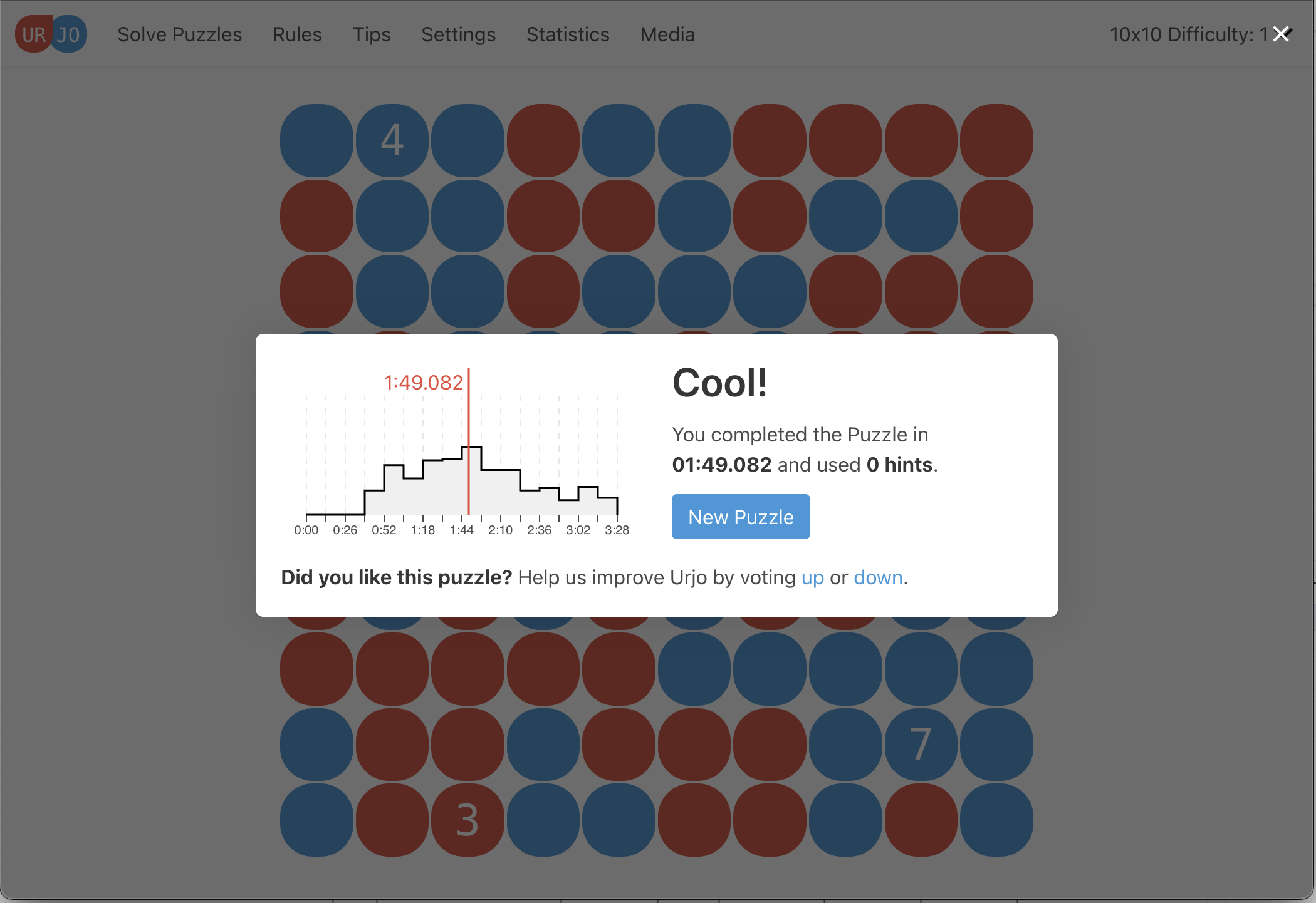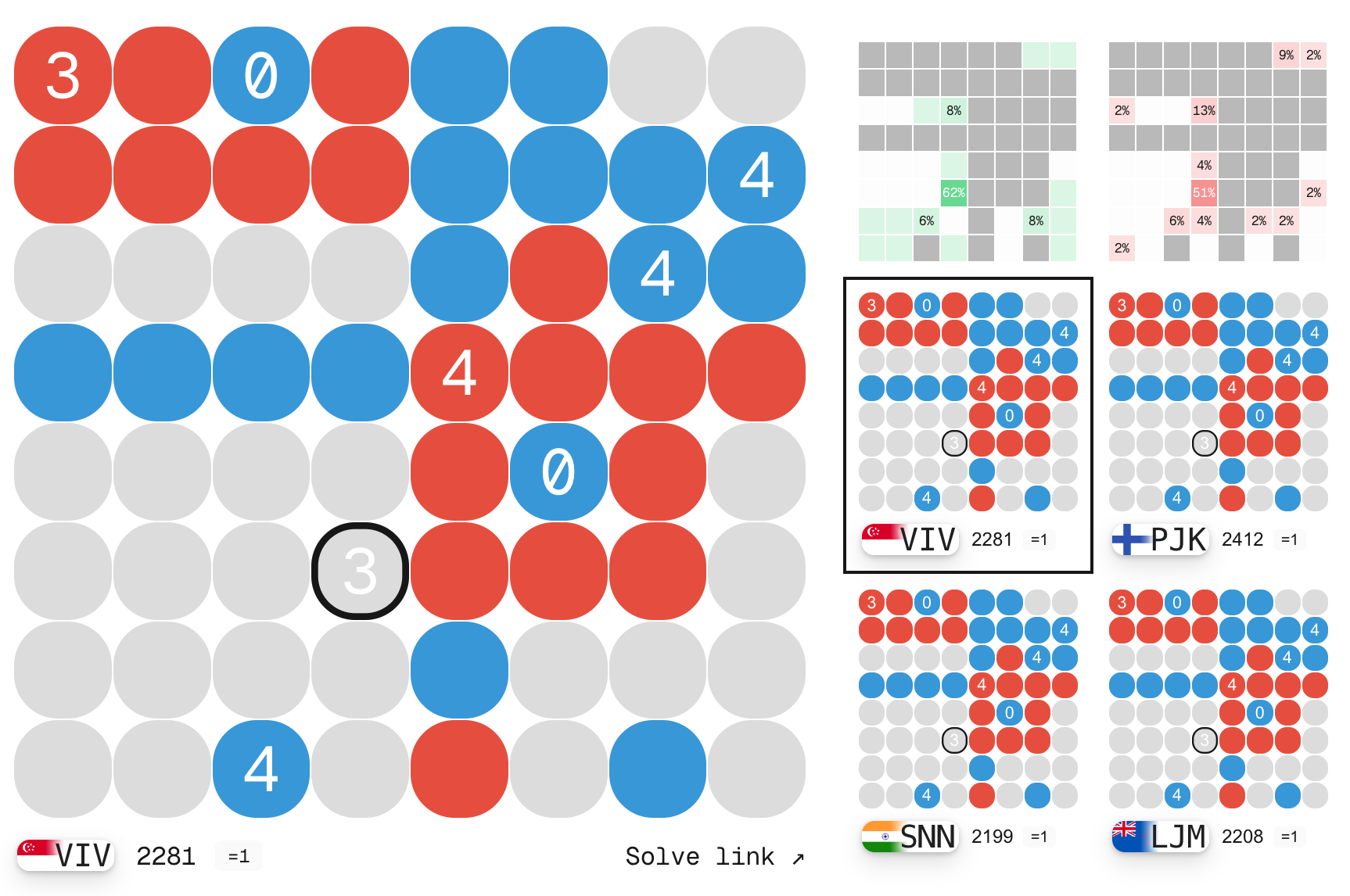 Urjo.com is a logical challenge where you determine which spots are red and which are blue.